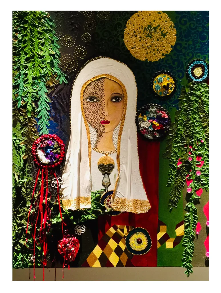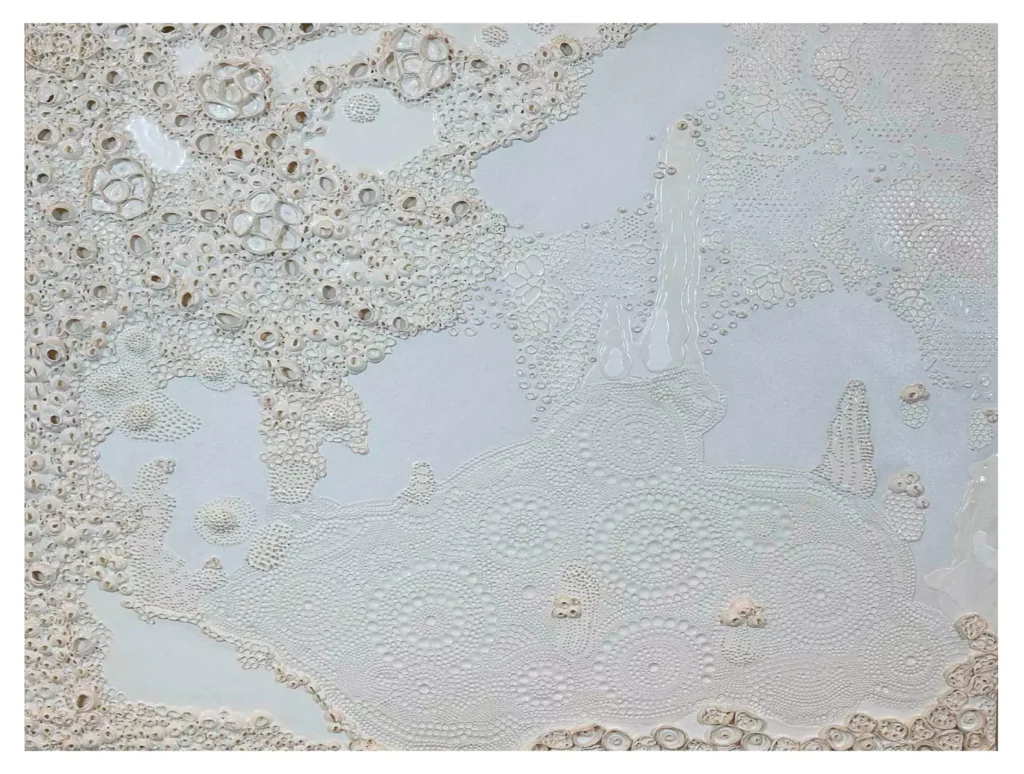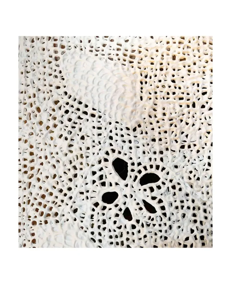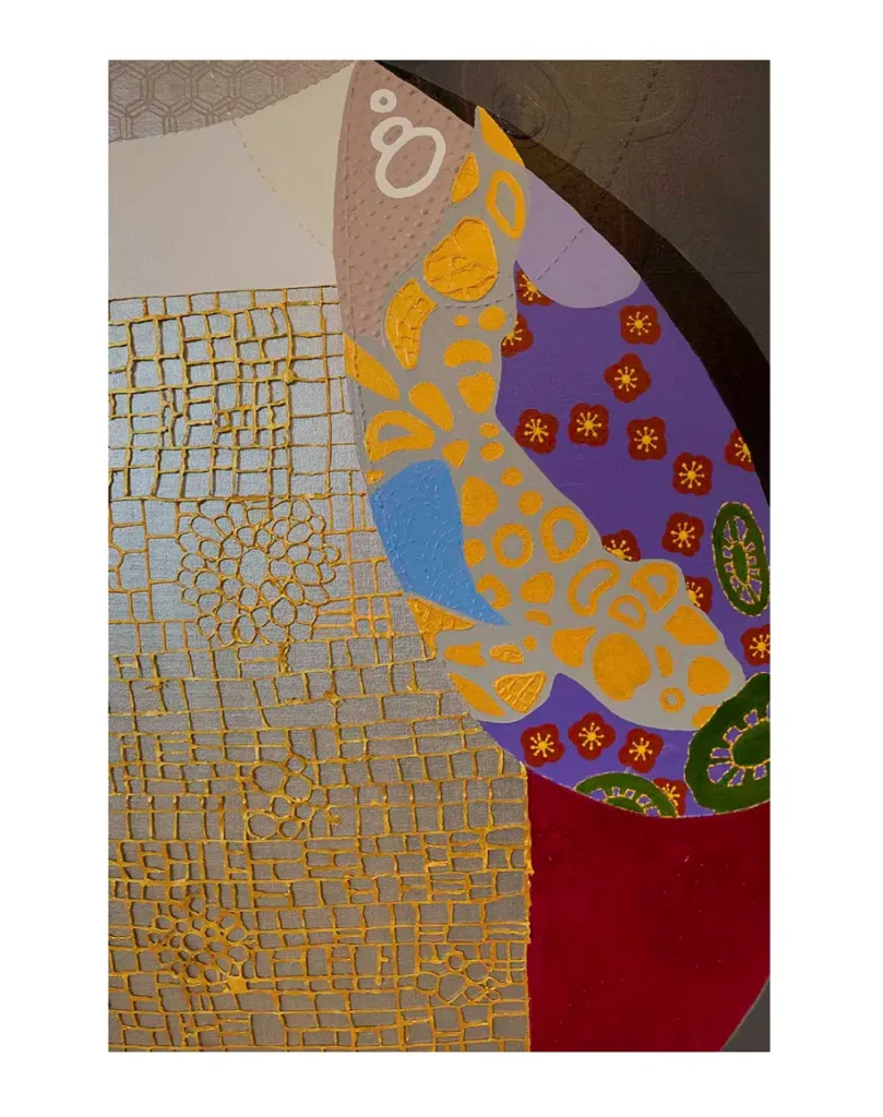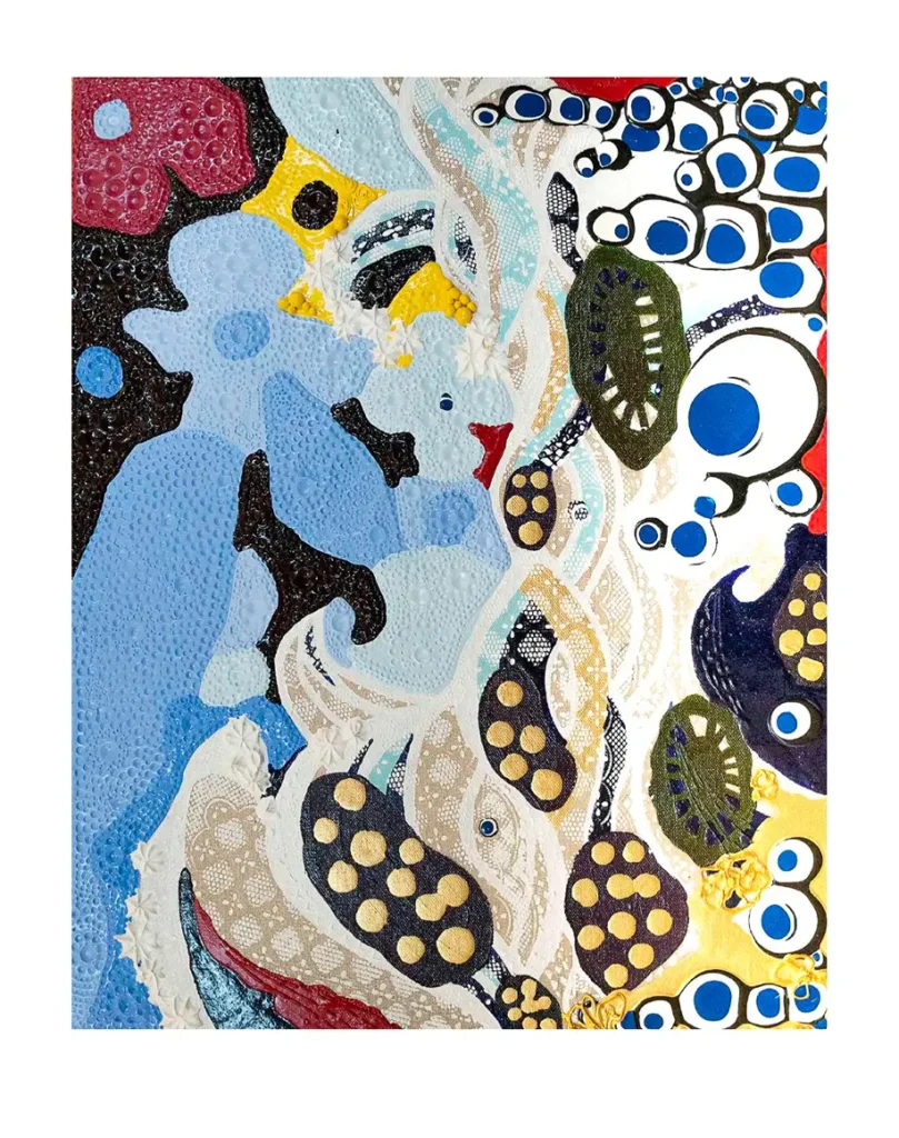 Seus trabalhos revelam um sistema visual baseado em pontilhados e linhas recorrentes, elementos que remetem ao universo têxtil. Especialmente ao bordado e ao crochê: práticas manuais que marcaram sua infância. Esses gestos são reconfigurados em pintura, como uma forma de “costura pictórica”, em que a tinta assume o papel de linha, e a tela, o de tecido. Assim, cada obra se liga à anterior e à próxima, compondo uma narrativa contínua de afetos e ancestralidade.